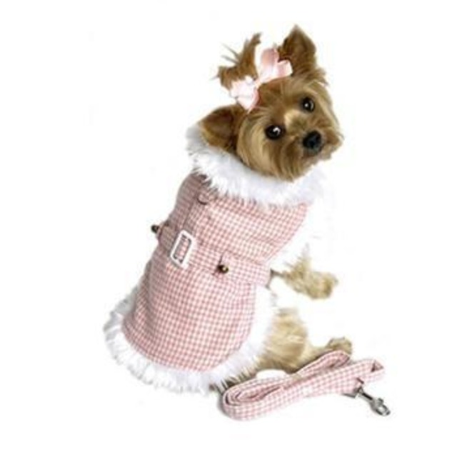 ファー付き格子柄ピンク&ホワイト・ハーネス・コート=リード付き