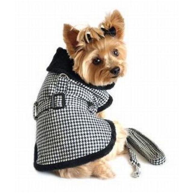 千鳥格子ハーネス・コート・ブラックホワイト=リード付き