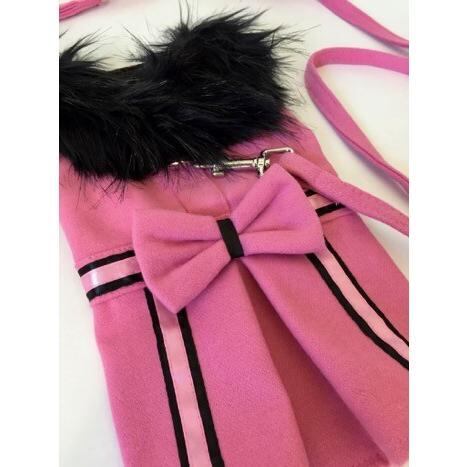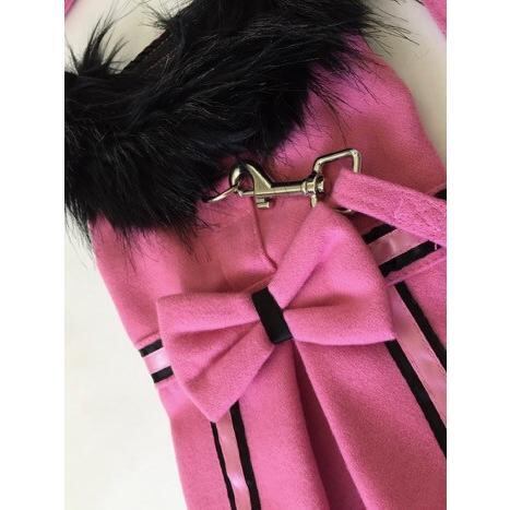 フワフワのブラックファーの襟と可愛いリボンがついたピンク×ブラックのハーネス・コートです。