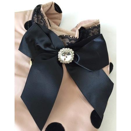ピンクの光沢ある素材にブラック・レースの襟元とブラック・リボンに大きなキラキラストーンがついたおしゃれな一着です。裾のフリルがキュートで、ピンクとブラックの色使いも素敵です。