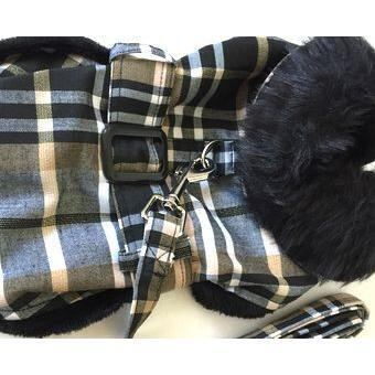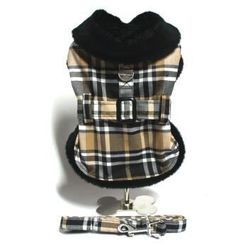 フワフワのフェイクファーの襟がついたブラウン×ブラック×ホワイトの格子柄のハーネス・コート。共布でできたリード付きです。