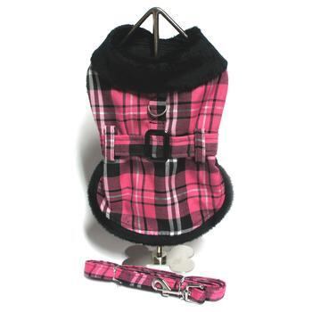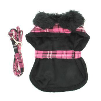 フワフワのフェイクファーの襟がついたホットピンク×ブラックの格子柄のハーネス・コート。
