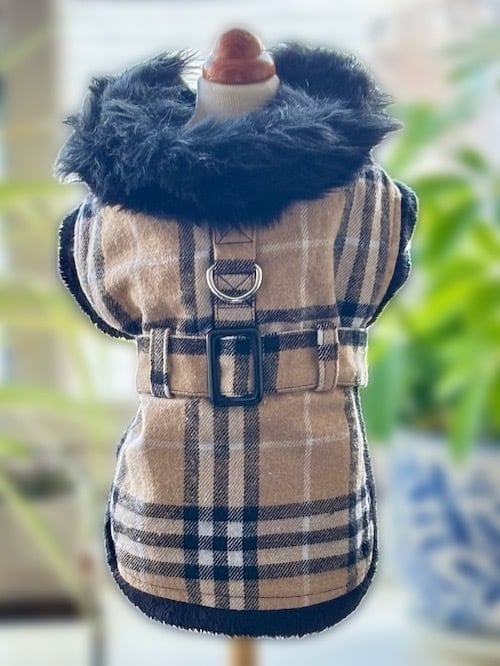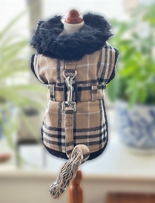 フワフワのフェイクファーの襟がついたベージュ×ブラックの格子柄のハーネス・コート。共布のリード付き。